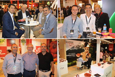 Vanaf linksboven met de klok mee: Roland Slappendel, Jaap Tanis en Kim Ask (Van Oers United) op bezoek bij Maarten van der Leeden van Rijk Zwaan; Jeffrey Moret en Cees van Vugt (Marni Organics) op bezoek bij Ingeborg van Geldermalsen (MurgiVerde); Looije was met zijn Spaanse bedrijf als exposant aanwezig; Leo Pels (midden) met zijn vrienden van aflader Ruleta
