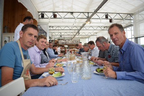 Plaats van handeling was De Beleving in Zeewolde, een biologische proeftuin waar door Bio Brass een stuk of 8 verschillende gewassen worden geteeld. Gerjan Snippe (rechts op de foto) vertelde over de biologische vollegrondsteelt en stak daarbij zijn enthousiasme voor rode bieten niet onder stoelen of banken. Het was dan ook geen toeval dat rode biet weer aan bod kwam bij het volgende onderdeel van het trendcafé: een kookwedstrijd.