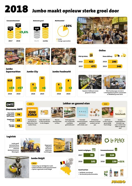 Door de ombouw van 23 EMTÉ supermarkten, de opening van nog eens 12 nieuwe Jumbo vestigingen en 2 sluitingen groeide het winkelbestand met 33 naar een totaal van 618. Als onderdeel daarvan gingen in 2018 3 nieuwe vestigingen van Jumbo Foodmarkt en eveneens 3 van het gemakswinkelconcept Jumbo City open. Jumbo zag hierdoor haar marktaandeel op de Nederlandse markt stijgen tot ruim 20%.