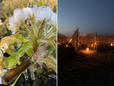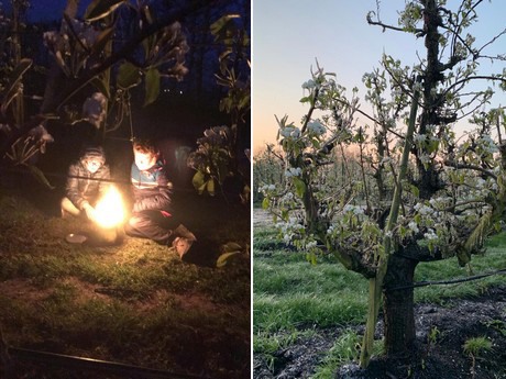 Tholen - In de boomgaard van de Magdalenahoeve in het Zeeuwse 's- Gravenpolder is het afgelopen weekend volop beregend. Het hele gezin Buijsrogge liep in de vroege uren door de boomgaard. "Op 12 hectare hebben we beregening kunnen toepassen en op 1 hectare werd de bloesem door middel van vuurpotten beschermd. Onze zoons van 8 en 10 hielpen hier heel graag aan mee. Zij hebben geholpen met het aansteken van de potten. Dit vonden ze helemaal geweldig en dat maakt het voor ons ook leuker. Daar zijn we steeds een half uur tot een uur mee bezig geweest. We hebben de potten tussen half 4 en half 8 's morgens laten branden", vertelt Niels Buijsrogge.