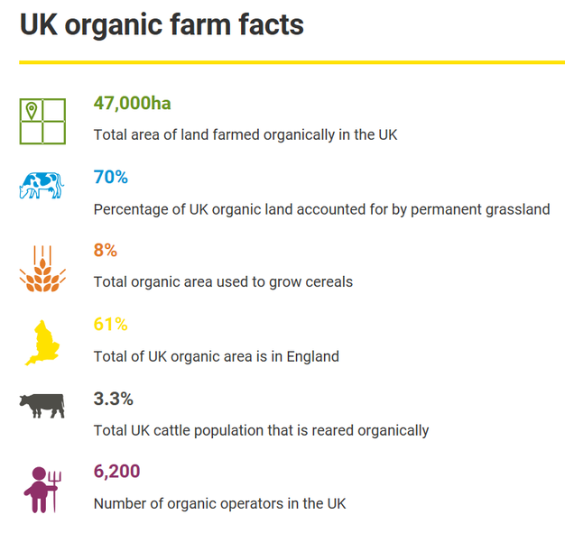 De nieuwste statistieken van Defra van 2018 tonen aan dat in het Verenigd Koninkrijk in totaal op 474 hectare biologische landbouw wordt bedreven, een afname van 8,5 % ten opzichte van het jaar ervoor.