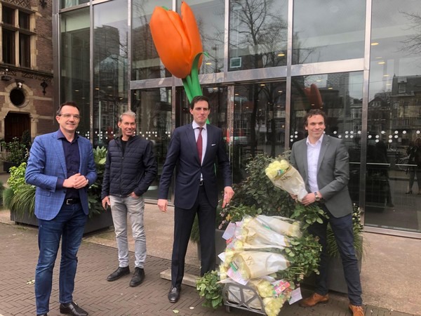 Minister Hoekstra neemt enkele bossen rozen in ontvangst uit handen van Dutch Greenhouse Delta op LinkedIn