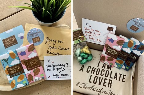 "De pakketten worden gratis geleverd bij die persoon thuis over volledig Belgiƫ. Het pakket wordt altijd voorzien van een kaartje waarop een persoonlijke boodschap kan komen."