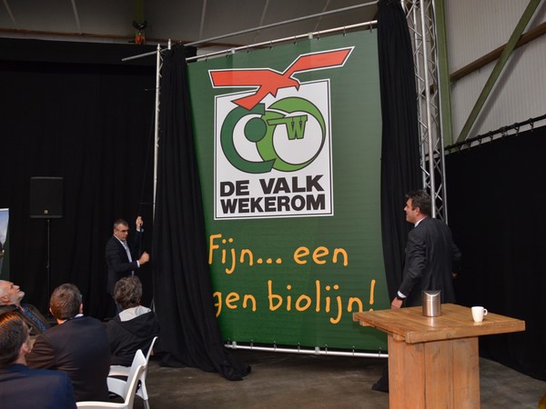 Directeur Mackaay en voorzitter van de raad van commissarissen dhr. Boer onthullen het geveldoek tijdens de opening van de eigen biologische productielijn.
