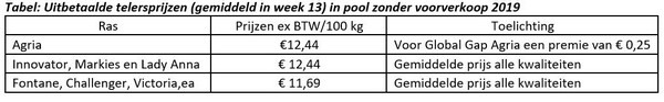 De pool zonder voorverkoop loopt over een volledig seizoen. Voor deelnemers maakt het niet uit of er vóór of na Covid-19 is geleverd. De fictieve opbrengst van de overheid is meegerekend in de poolopbrengst en vervolgens gekort bij de telers die individueel steun hebben ontvangen. Naast de hierboven genoemde telersprijzen in de pool wordt na afloop van het boekjaar een dividend betaald aan de leden. In de laatste jaren is dat tussen de € 100, = en € 167, = per hectare geweest. Dit dividend is niet verwerkt in bovenstaande prijzen.