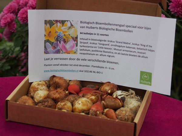 Verras jezelf, iemand anders en de bijen. Een geschenk voor nu met een belofte voor bloemen in de lente. Biologische bloembollen geteeld in samenwerking met de natuur. Huiberts Biologische Bloembollen uit Sint Maartensbrug heeft een brievenbusdoosje vol biologische bloembollen geïntroduceerd. Dit brievenbusdoosje bevat 44 bolletjes in 11 soorten, speciaal voor de bijen.