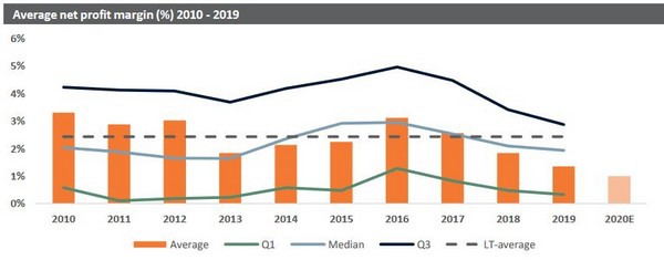 Ontwikkeling van de winstmarge in de afgelopen 10 jaar. 2019 was het slechtste jaar en 2020 ziet er niet veel beter uit.