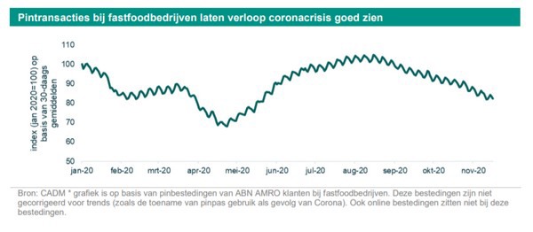 Uit transactiedata van ABN AMRO blijkt hoezeer de crisis heeft toegeslagen bij fastfoodlocaties en restaurants. Vanaf maart vielen de bestedingen flink terug en veerde weer op na de lockdown, maar door de tweede lockdown in oktober was dit herstel van korte duur en daalden de bestedingen weer. Dit laat duidelijk zien dat ook de tweede golf besmettingen negatieve uitwerking heeft op de vraag naar frites. ABN AMRO verwacht dat de fastfoodconsumptie zich in 2021 weer volledig herstelt.