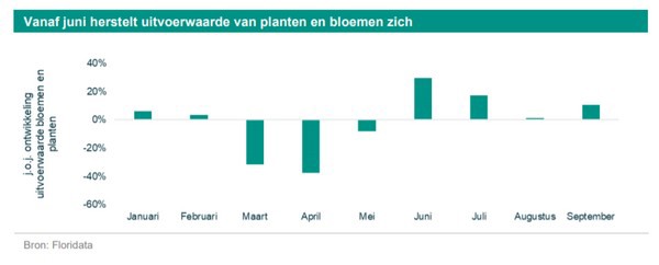 Vanaf juni herstelde de vraag zich snel, zo blijkt uit de uitvoercijfers van Floridata. De uitvoerwaarde van planten en bloemen steeg in juni met 30 procent ten opzichte van dezelfde maand vorig jaar en in juli met 17 procent. Ook de maanden daarop waren beter dan vorig jaar. Deze opleving kon de eerste klap echter niet meer goed maken; sinds het uitbreken van de crisis ging er 200 miljoen euro aan uitvoerwaarde verloren.