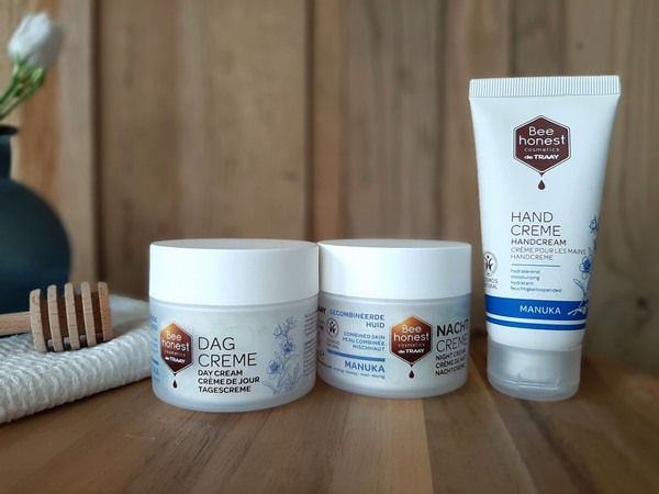 De nieuwste aanwinst in de verzorgingslijn van Bee honest cosmetics is de Manuka lijn met een handcrème, dag- en nachtcrème. Manuka staat erg in de belangstelling en dat is niet zo gek. Het heeft bijzondere eigenschappen en wordt vaak toegepast voor huidproblemen. Manuka honing helpt de huid hydrateren, herstellen en te kalmeren. Deze honing is verwerkt in een dag- en nachtcrème en handcrème. De crèmes zijn BDIH/COSMOS gecertificeerd, ruiken prettig en bevatten geen palmolie.