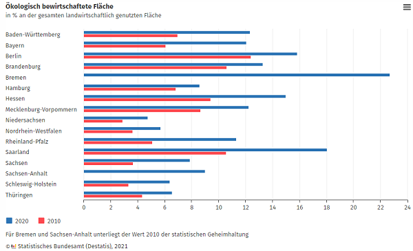 De trend in Duitsland om over te stappen op biologische land- en tuinbouw houdt aan. In 2020 werkten volgens het Duitse Bureau voor de Statistiek bijna 26.100 land- en tuinbouwbedrijven volgens de regels van de biologische teelt. Dat is een groei van 58% ten opzichte van 2010 (16.500 bio-bedrijven). In dezelfde periode is het aandeel van biologische land- en tuinbouwbedrijven op het totale aantal teeltbedrijven gestegen van 6% tot 10%. Meer dan de helft van alle bio-bedrijven is in Bayern (38%) of Baden-Württemberg (17%) gevestigd.