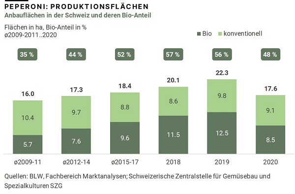 Volgens cijfers van de 'Schweizerische Zentralstelle für Gemüsebau und Spezialkulturen' (SZG) waren paprika's in 2020 de op twee na populairste groentensoort in Zwitserland, met een consumptie van 5,3 kg per hoofd van de bevolking. De meeste paprika's werden geïmporteerd (2020: 98%). Er heeft zich echter een kleine binnenlandse teelt ontwikkeld, die vooral opvalt door biologische teelt; het bio-aandeel aan het totale paprika-areaal in 2020 bedroeg 48%. Gedurende de afgelopen tien jaar was er sprake van een duidelijke groei van het bio-areaal, in het afgelopen jaar was er echter sprake van een sterke afname van 8%.