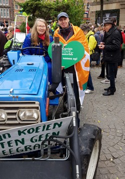 Foto rechtsboven: Bert gehuld in Demeter vlag met Maria Inckmann van Gaalen, voorzitter van de BD Vereniging op de trekker op de Dam.