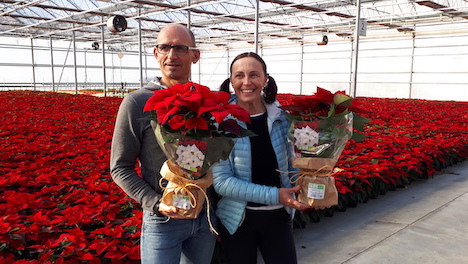 Rosanna Bertoldin en Carlo Simonato, eigenaar van het gelijknamige bedrijf. Zij tonen de kerststerren, waarmee ze bij Fratelli Simonato rond deze tijd druk zijn.