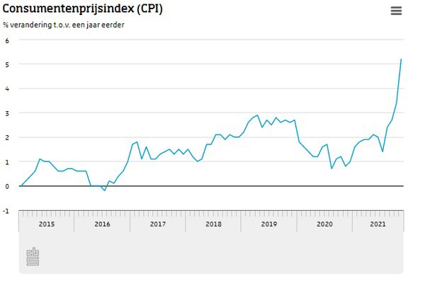 Consumentengoederen en -diensten waren in november 5,2 procent duurder dan een jaar eerder, meldt het CBS. De inflatie in november was de hoogste na september 1982. In oktober was de inflatie 3,4 procent. De snelle stijging van de inflatie is vooral toe te schrijven aan de prijsontwikkeling van gas, elektriciteit, motorbrandstoffen, voeding en kleding.