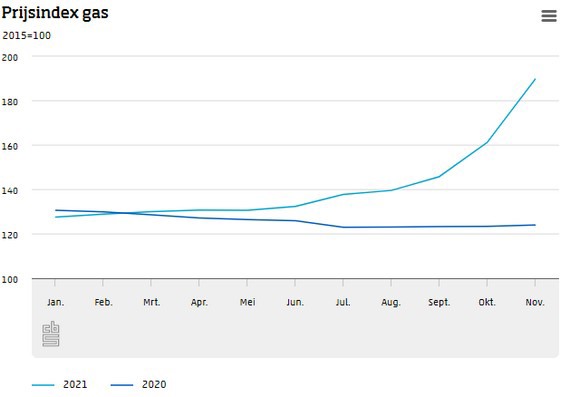 De prijzen van gas en elektriciteit zijn in november verder gestegen. Gas was in november 53 procent duurder dan een jaar eerder. In oktober was dat 30,6 procent. De prijsstijging op jaarbasis van elektriciteit nam toe van 39,6 procent in oktober naar 74,9 procent in november. De bijdrage van gas en elektriciteit aan de totale inflatie van 5,2 procent in november was ruim 2 procentpunt.