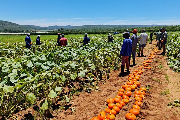 De oogst van de Kuri-pompoenen (ook wel Hokkaido-pompoenen genoemd) in de regio Waterberg in Limpopo (Foto: OrganoGroup)