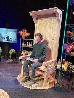 Krispijn op de houten troon, vervaardigd door Ruud Hendriks en zoon op de Warmonderhof. Edith Lammerts van Bueren, voorzitter van de BioAcademy, leidde de Boerentroonrede in.