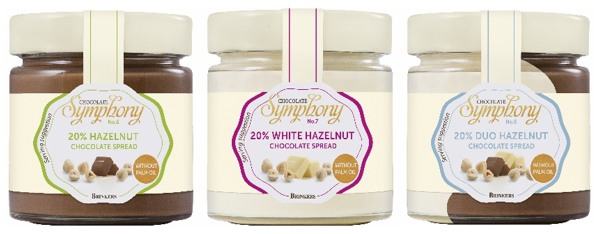 En er is meer nieuws: de premium Chocolate Symphony hazelnootpasta's worden nu zonder palmolie geproduceerd. De drie smaken (witte hazelnoot-, duo hazelnoot- en bruine hazelnootpasta) zijn nu zonder palmolie verkrijgbaar en ze bestaan allemaal voor 20% uit de beste Italiaanse hazelnoten. "We gebruiken de beste Italiaanse hazelnoten die verkrijgbaar zijn, waardoor een diepe en rijke smaak ontstaat, perfect voor onze premium chocoladepasta's", aldus Claudine.