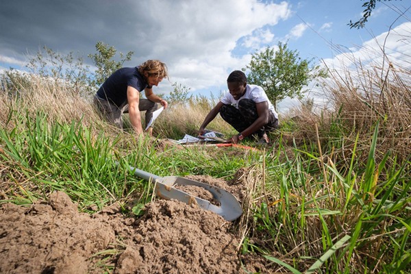 Studenten bestuderen bodemprofielen (Foto Kees van Veluw).