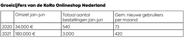De Nederlandse shop van KoRo doet het uitzonderlijk goed sinds de lancering in 2019. In de periode januari-juli 2021 behaalde zij een omzet van 180 000 euro, wat neerkomt op een omzetstijging van 429% ten opzichte van het voorgaande jaar. Bovendien verkoopt de detailhandel-onderneming haar producten in 15 andere EU-landen.