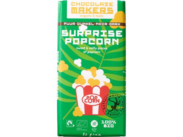 Chocolatemakers brengt samen met Moonpop popcorn een nieuwe pure chocoladereep op de markt. Deze surprise reep is een 100% biologische chocoladereep met 60% Peruaanse chocolade en afwisselend zoete en zoute stukjes popcorn waardoor elk hapje een verrassing wordt.