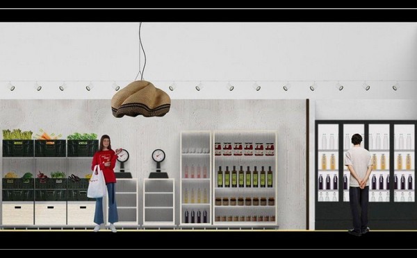 De nieuwe lokale winkelformule, ontworpen door Francesco Faccin voor EcorNaturaSì, kanaliseert de 40x60 module van de krat die in de hele tuinbouwketen wordt gebruikt om afval te verminderen en circulariteit te stimuleren.