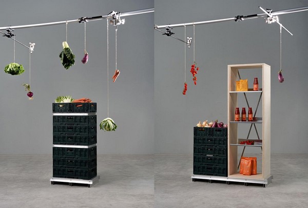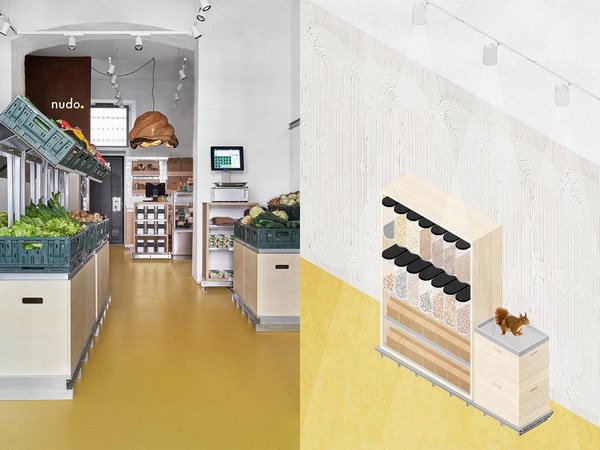 Het ontwerp van de ruimtes en de inrichting van Nudo is geïnspireerd op de opvouwbare plastic kratten van 40x60 die in de hele keten van EcorNaturaSì worden gebruikt. "Toen ik het hoofdkantoor van het bedrijf bezocht, werd ik getroffen door de grote machine die de kratten wast voordat ze opnieuw worden gebruikt. Het bedrijf heeft er ongeveer 500.000 en heeft een standaardiseringsproces voor ze geperfectioneerd in alle stadia van de keten, van het veld tot de eindconsument, waarbij hergebruik wordt bevorderd en afval wordt verminderd en waarbij ook voor de uiteindelijke verwijdering wordt gezorgd," zegt Faccin. "De krat is gemaakt van plastic, maar het idee is ingegeven door echt duurzaam denken."