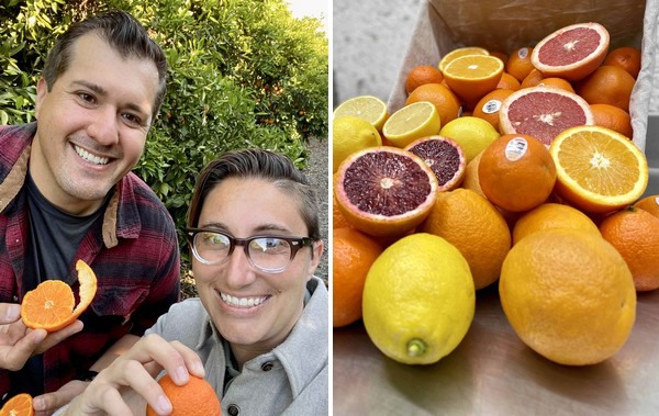 Links: CJ Buxman en Bianca Kaprielian; rechts: biologische citroenen, bloedsinaasappelen, Minneolas, Satsuma's en grapefruit