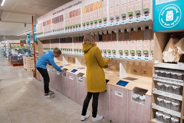 Albert Heijn lanceert een nieuw concept waarmee klanten een groot deel van hun dagelijkse boodschappen duurzamer kunnen doen: AH Verpakkingsvrij. Het werkt heel simpel: klanten vullen een herbruikbare zak of pot met een product – bijvoorbeeld muesli, pasta, broodbeleg, thee en noten - en komen zo met een stuk minder wegwerpverpakkingen thuis. Deze beweging past in de ambitie van Albert Heijn om in 2025 twintig miljoen kilo minder verpakkingsmateriaal te gebruiken.