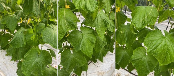 In komkommer zijn ook goede ervaringen opgedaan met de inzet van Vacciplant. Onderstaande foto's tonen de resultaten van een onderzoek naar echte meeldauw in komkommer uitgevoerd door Botany in 2021. De resultaten van een solo inzet van Vacciplant zijn goed, evenals de inzet van Vacciplant in combinatie met het curatieve product Karma**.
