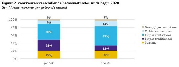 Steeds meer Nederlanders betalen bij voorkeur contactloos, zowel met de pinpas als met de mobiele telefoon. Aan het begin van 2020 betaalde de helft van de Nederlanders het liefst contactloos: 40% gaf de voorkeur aan contactloos betalen met de pinpas, en 9% aan contactloos betalen met de mobiele telefoon. Aan het einde van 2021 lag de voorkeur voor contactloos betalen 14 procentpunten hoger: toen betaalde 49% van de Nederlanders het liefst contactloos met de pinpas en 14% het liefst contactloos met de mobiele telefoon. De stijging aan populariteit van deze twee betaalmethodes is ten koste gegaan van de populariteit van pinnen op de traditionele manier, waarbij de pinpas in de betaalautomaat moet worden gestoken.
