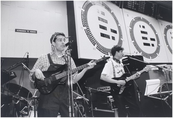 Optreden van de band De Kromme Jongens in de groenteveiling Westland Noord aan de Nieuweweg in Poeldijk op 9 april 1996 (Westlands fotobureau)