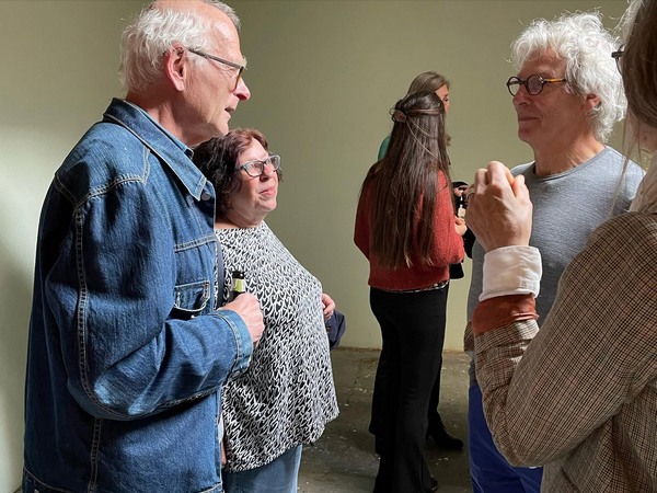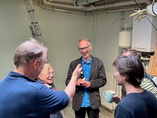 Jos (midden) in gesprek met wat bezoekers van de afscheidsborrel