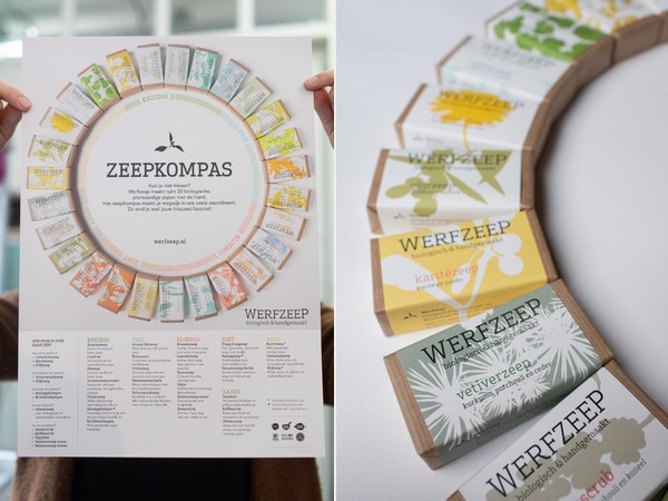 Werfzeep maakt ruim 20 biologische, plantaardige zepen met de hand. "We merken dat liefhebbers van onze zeep weleens moeite hebben met kiezen. Of dat ze niet weten welke zepen de geur hebben die ze zoeken. Om hen meer overzicht en houvast te geven, maakten we het Zeepkompas. Hierin zie je ons assortiment in één oogopslag." Bij alle zepen staat een (geur)beschrijving en daaronder staan de zepen ook per functie - zoals haar wassen of scrubben - op een rij.