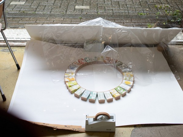 En zo voerden we lange discussies en legden we eindeloos zepen in een cirkel, zoals hierboven op een regenachtige dag in het atelier. Uiteindelijk kwamen we met medewerking van ons hele team op de indeling uit zoals die nu is. De cirkel geeft een handig overzicht van 'geurtonen' – zoet, fris, kruidig, et cetera – en laat zien hoe ze in elkaar overlopen.