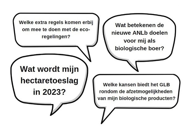 Daarnaast stelt GLB 2023 nieuwe gelden beschikbaar voor regionale en branche-gerichte samenwerkingen. Zowel voor regionale natuurdoelen (ANLb) als samenwerkingen in productie, innovatie en afzet. Graag gaan we daarom in gesprek: is een biologische branche- of producentenorganisatie een goede vorm om de biologische markt te stimuleren? Bijzonder is ook de mogelijkheid om voor duurzame voedselsystemen een uitzondering te maken op het kartelverbod. Dit biedt kansen voor een sterkere marktpositie van biologische boeren.