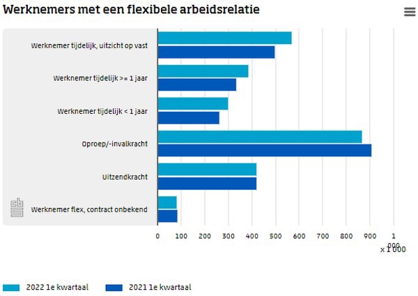 Het aantal werknemers met een flexibele arbeidsrelatie nam in het eerste kwartaal van 2022 toe ten opzichte van een jaar geleden. Vooral het aantal flexibele werknemers met relatief meer zekerheid, zoals mensen met een tijdelijk contract met uitzicht op een vast contract, was hoger; er waren juist minder oproepkrachten. Ondanks de toename met 111 duizend is het totaal aantal werknemers met een flexibele arbeidsrelatie nog steeds 17 duizend lager dan net voor de coronacrisis. Dat melden het CBS en TNO op basis van een gezamenlijke analyse van de nieuwste gegevens over flexibel werk in Nederland.