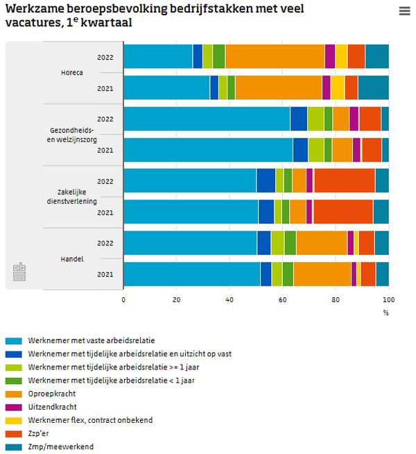 De krapte op de arbeidsmarkt speelt in bijna alle bedrijfstakken. De meeste vacatures staan open in de handel, de zakelijke dienstverlening, de zorg en de horeca. Op de handel na, nam in deze bedrijfstakken de werkzame beroepsbevolking van 15 tot 75 jaar ten opzichte van een jaar geleden toe. In de handel, zakelijke dienstverlening en zorg nam bij de flexcontracten van werknemers met name het aandeel tijdelijke contracten met uitzicht op vast toe, met 1 procentpunt. In de handel nam daarnaast ook het aandeel langdurige tijdelijke contracten (een jaar of langer) toe, eveneens met 1 procentpunt.