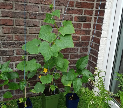 Een komkommerplant tussen paprikaplanten en (doorgeschoten) rucola in een stadstuintje