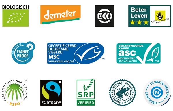 - Beter Leven Keurmerk (2 en 3 sterren) voor zuivel, eieren en vlees