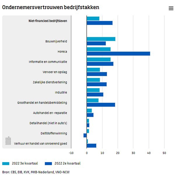 Het ondernemersvertrouwen nam aan het begin van het derde kwartaal van 2022 af. Dat geldt voor de meeste bedrijfstakken, maar het ondernemersvertrouwen bleef in alle bedrijfstakken positief. Meer dan de helft van de ondernemers zegt kostenstijgingen voor een klein gedeelte of helemaal niet te kunnen doorberekenen aan hun klanten. Dit melden het CBS, KVK, het Economisch Instituut voor de Bouw, MKB-Nederland en VNO-NCW op basis van de Conjunctuurenquête Nederland.