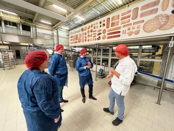 Carl Siegert (tweede van rechts) naast Hawre Rahimi. Ze staan voor het bakkerscafé in het pand van de bakkerij.