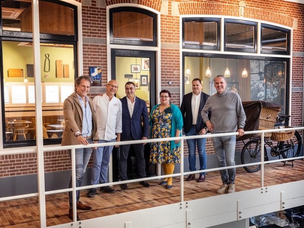 Carl Siegert (tweede van rechts) naast Hawre Rahimi. Ze staan voor het bakkerscafé in het pand van de bakkerij.