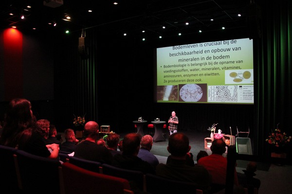 Na de aftrap door avondvoorzitter Chantal Duijn nam bodembioloog René Jochems het stokje over. René: "De bodem is de maag van de plant. Het maaiveld de mond! Vertering werkt zoals de pens van de koe." Hierbij werd al snel duidelijk dat één van de sleutels voor een gezonde bodem de juiste bemesting is. "Bokashi is kuilvoer voor de bodem." Koeien gezond houden begint bij aandacht voor bodembiologie, want biomassa = kassa! Er zijn veel mogelijkheden om de bodem te verbeteren, bijvoorbeeld door bij gewasrotatie te kiezen voor een (ander) gewas dat samenwerkt met de bodem of andere bemesting toe te passen om de bodembiologie te bevorderen, zoals (meer) bemesten met vaste mest, bokashi of compost.