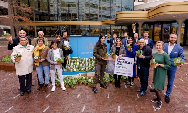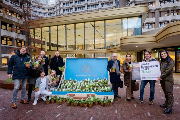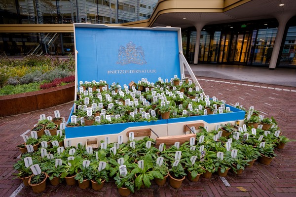 Ministers Van der Wal voor Natuur en Stikstof en Adema van Landbouw Natuur en Visserij en diverse Tweede Kamerleden namen dinsdagmiddag een levensgrote Prinsjesdagkoffer met planten in ontvangst vlak voor de start van de begrotingsbehandeling van LNV. De betrokken organisaties, waaronder bouwers, boeren, zorgverleners, natuurbeschermers en banken, roepen met deze actie het kabinet op om te bouwen aan een toekomst waarin ruimte is voor natuur, een gezond klimaat en natuurvriendelijke landbouw. Zij vragen hen door te pakken met de uitvoering van het coalitieakkoord, met oog voor natuur.