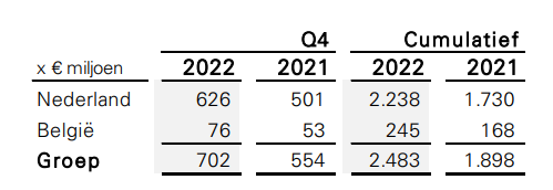 In Nederland was sprake van een omzettoename van 29,3% (Q4: toename van 24,9%). In België was de omzettoename 46,3% (Q4: toename van 45,3%). Deze mutaties waren volledig autonoom.