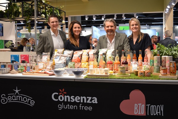 Links Menno Snijders in de stand op de Biofach. Naast hem collega's Anneloes Hoorneman, Pieter Dirven en Lisa Bastiaansen.