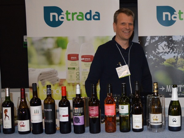 Ramon tijdens de Biobeurs. Met voor hem o.a. twee van de Caprasia wijnen (tweede van links en tweede van rechts).
