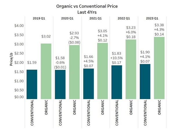 De totale groente- en fruitafzet groeide in het eerste kwartaal van 2023 met 2,6% in waarde en daalde met 1,3% in volume ten opzichte van dezelfde periode in 2022. De verkoop van biologische groenten en fruit was in het eerste kwartaal van 2023 goed voor bijna $ 2,4 miljard en 319 miljoen kilo.